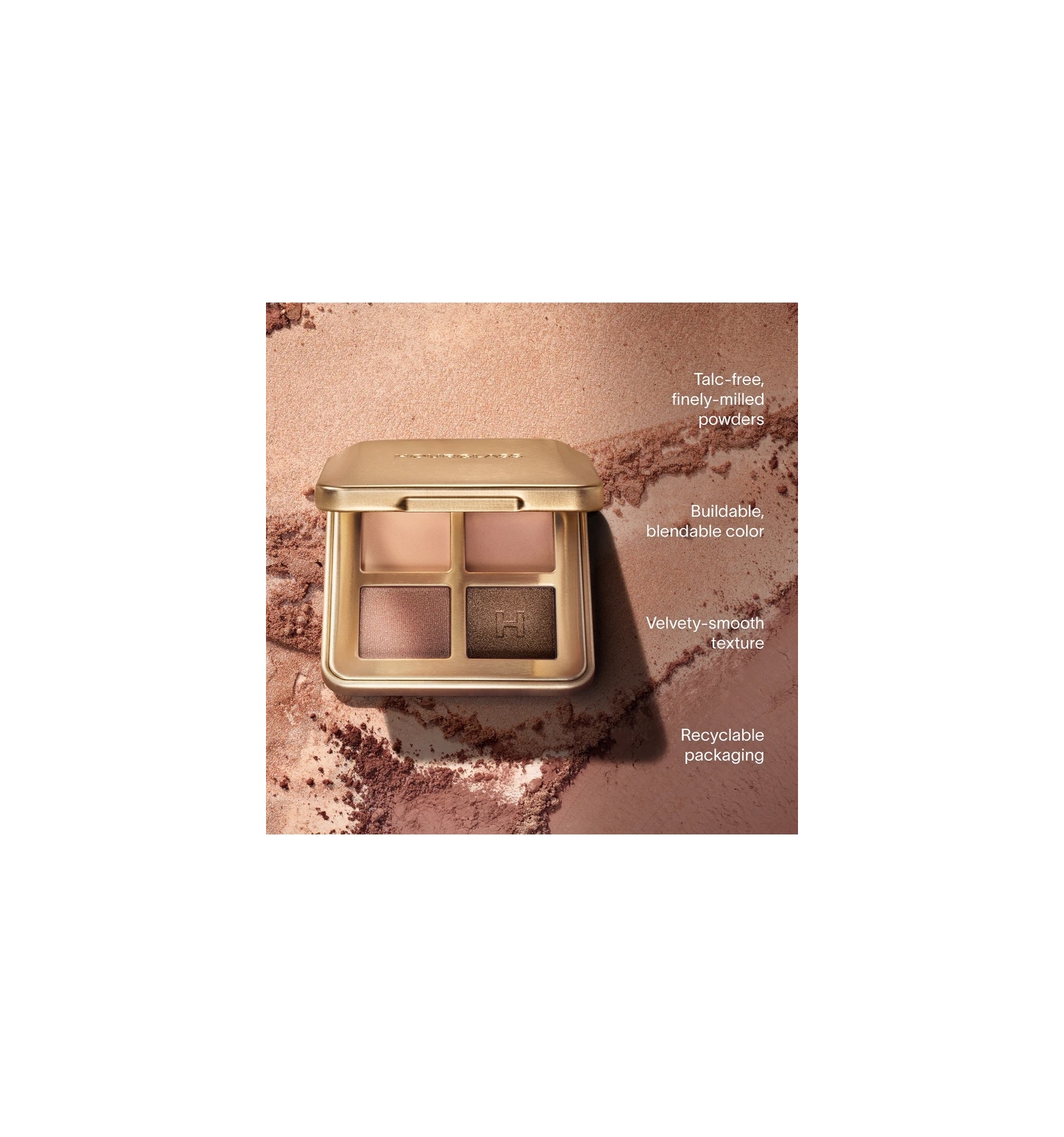 - 4 x 0.3 oz/1g Eyeshadows in shimmer pale champagne, matte warm sand, metallic golden copper, matte ochre brown
