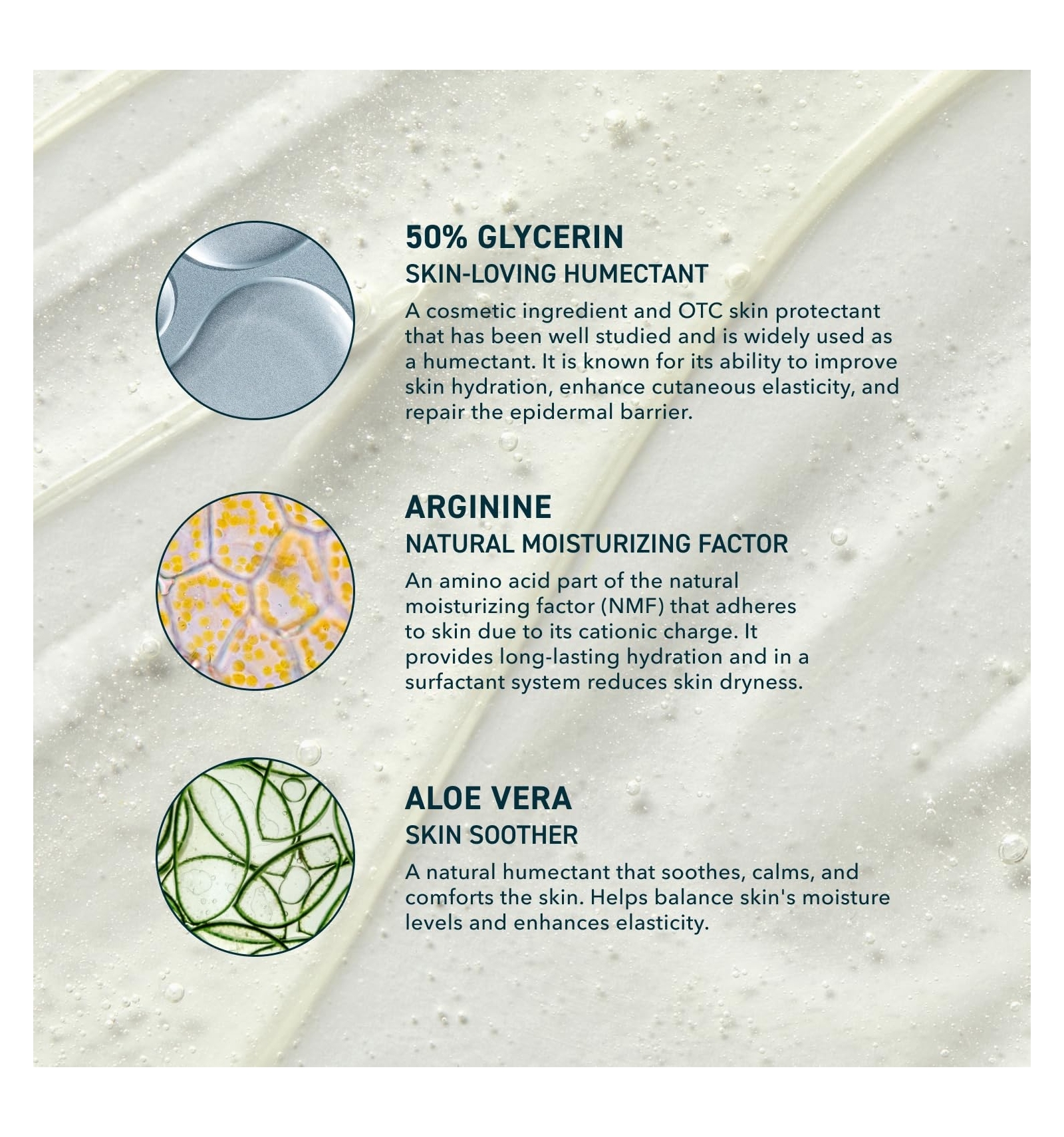 - Glicerina 50 %, inulina, estimuladores de acuaporina, arginina, avena, aloe