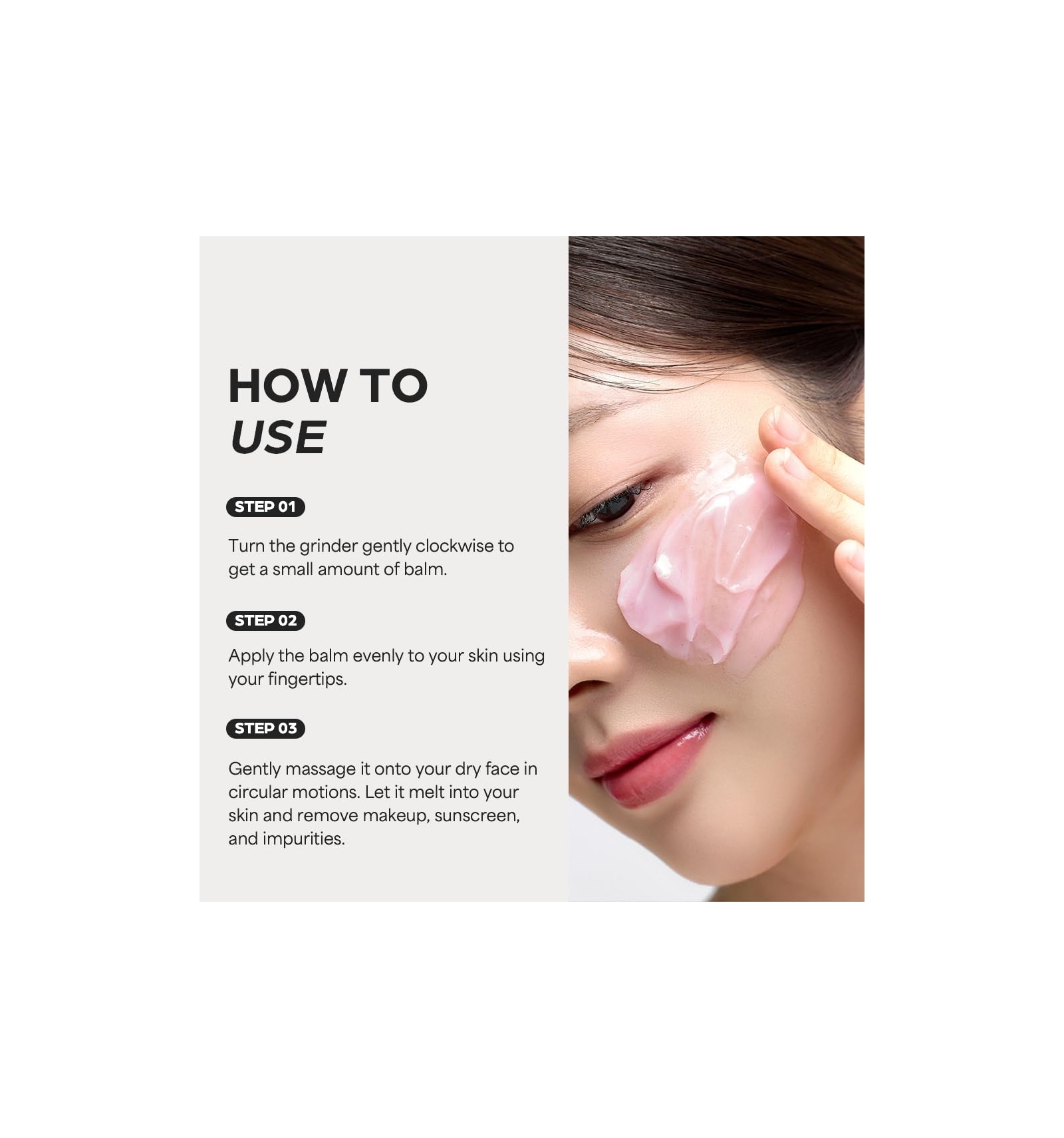 Un bálsamo de limpieza que se transforma en aceite y luego en leche al contacto con el agua. Discurre suavemente, derrite maquillaje, bloqueador e impurezas, y te deja una piel limpia, equilibrada e hidratada, sin residuos ni resequedad. Gracias al dispensador en forma de “grinder”, obtienes la cantidad justa sin ensuciarte.