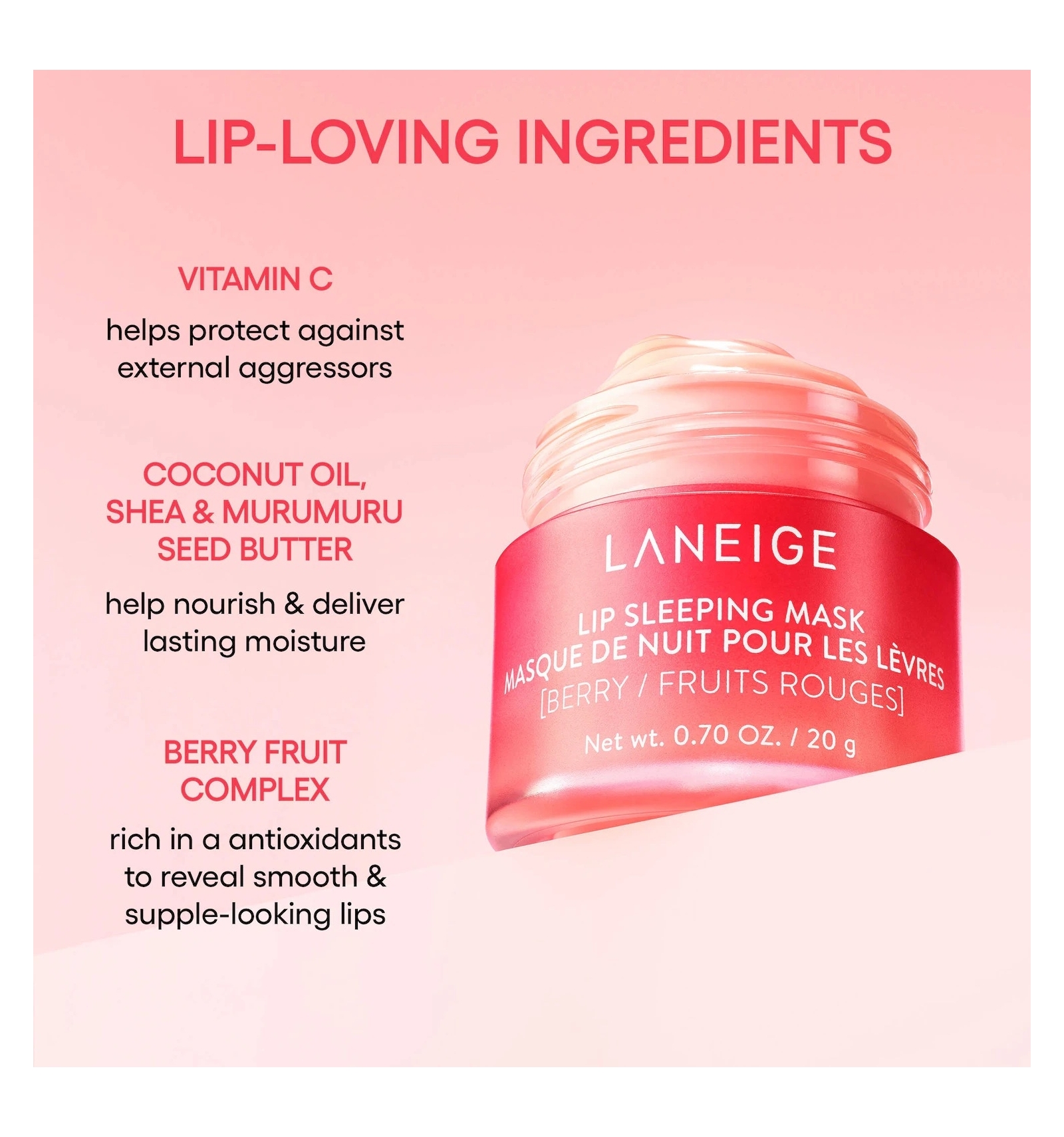 Berry Mix Complex™: Rico en vitamina C y antioxidantes de una mezcla nutritiva de frambuesas, fresas, arándanos, bayas de goji y arándanos, Berry Mix Complex ™ suaviza y suaviza, revelando unos labios suaves y flexibles.