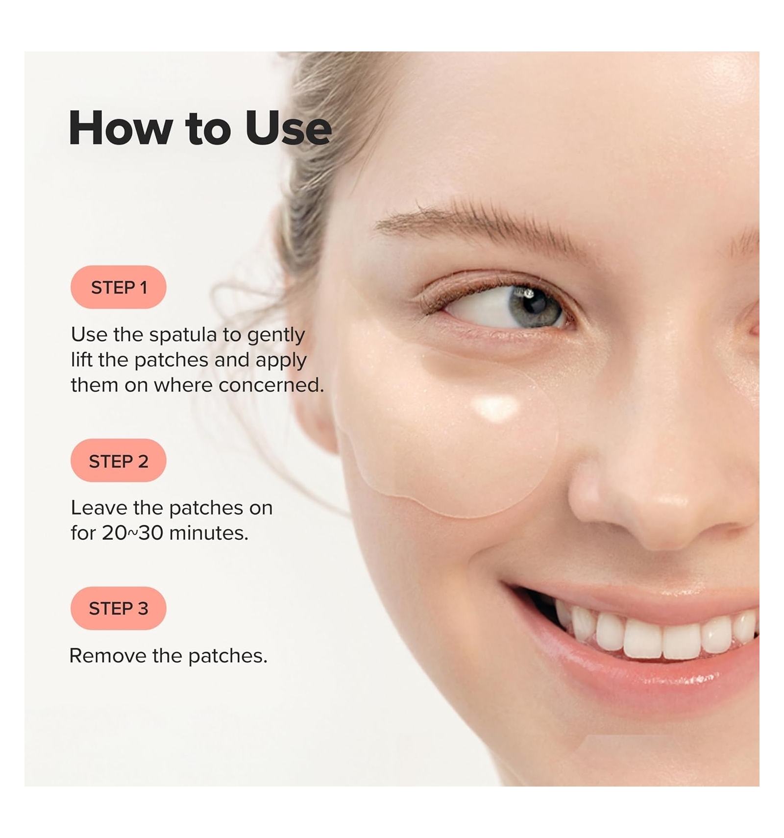 - Colocar un parche bajo cada ojo sobre piel limpia; dejar actuar 15–30 min; retirar y dar suaves toques a la esencia para absorberla.