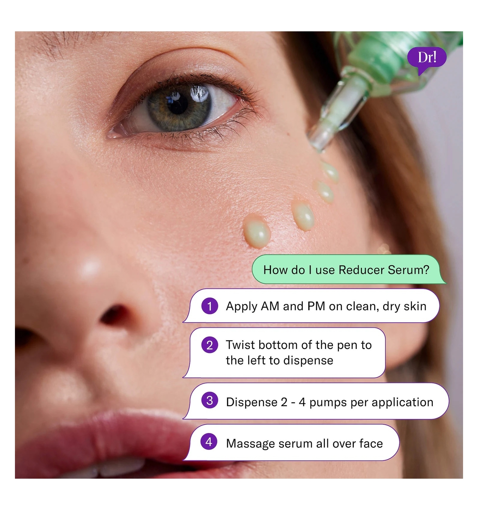 - Aplicar 2–4 pumps mañana y noche sobre piel limpia y seca; masajear suavemente.
